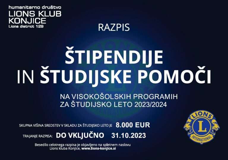 Lions klub Konjice objavlja razpis Športnih štipendij ZA mlade športne upe za športno sezono 2023/24, s katerim uresničujemo osnovni cilj dobrodelne akcije – pomagati mladim perspektivnim športnikom iz socialno šibkih